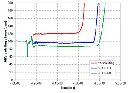 Where no shielding material is applied, a considerable deviation will occur from the standard value of 100Ω, but proper use of the SF-FC and the bonding method enable matching the standard value of 100Ω.