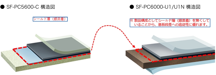 5Gの本格導入により大容量/低遅延/多数同時接続が可能となり、様々なモノがワイヤレスで繋がる時代が来るとされています。自動車においても自動運転技術の向上に伴い、センサー等の電子部品増加が見込まれノイズ対策の重要性が増しています。 SF-PC6000シリーズ、SF-FT6000シリーズはシールド層(銀蒸着)を無くすことで、高段差にも対応できるシールドフィルムとなっています。